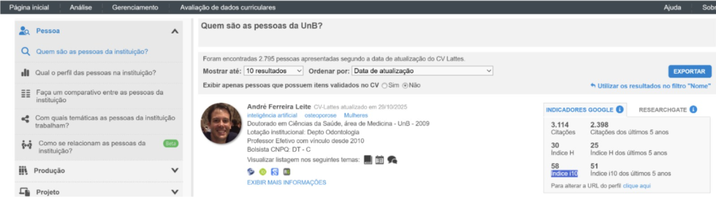 Ao apresentar o i10-index de cada integrante da base, o Stela Experta© possibilita a visualização do impacto individual e coletivo da produção científica, identificando docentes com elevada visibilidade acadêmica e áreas de destaque institucional.